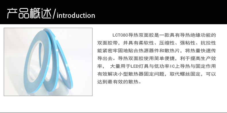 简介:LCT080导热双面胶以玻纤为基材加入导热粉经过特殊工艺制作而成的一款具有绝缘导热性能的双面胶带,材质柔软方便使用、压缩性能好导热性能更好、粘性强、抗拉性强,能紧密牢固地贴合热源器件和散热片从而将热量快速传导出去。导热双面胶使用简单便捷,利于提高生产效率,大量用于LED灯具与低功率IC上导热与固定作用,有效解决小型散热器固定问题,取代螺丝固定,可以达到最有效的散热。可代替热熔胶,镙丝、扣具待固定方式